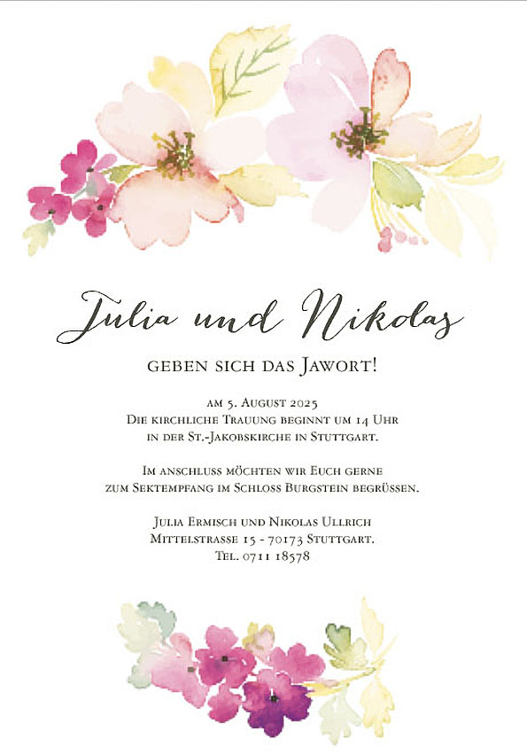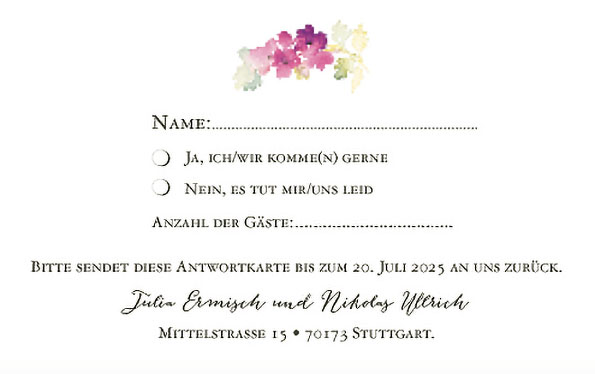 Die Texte werden von unseren Profis passend zur Karte in Form gebracht. In Kürze erhaltet Ihr noch vor Druckbeginn per E-Mail eine PDF-Datei zur Ansicht. Hier ist die Karte zu sehen, wie sie bedruckt aussehen wird. Natürlich könnt Ihr dann an Euren Texten noch Änderungen vornehmen lassen – ohne Aufpreis.