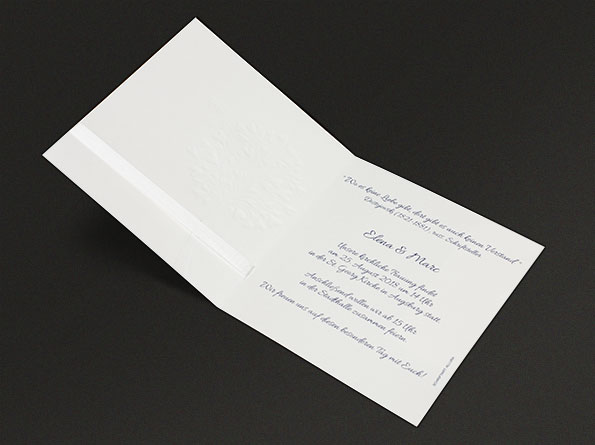 Ein besonderes Detail ist das kleine Kärtchen mit Euren Namen, das liebevoll mit einem Band an die Karte geknüpft wird. Diese edlen Einladungskarten strahlen pure Eleganz aus und sind ein echter Hingucker für Euren großen Tag.