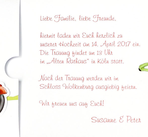 Die Texte werden von unseren Profis passend zur Karte in Form gebracht. In Kürze erhaltet Ihr noch vor Druckbeginn per E-Mail eine PDF-Datei zur Ansicht. Hier ist die Karte zu sehen, wie sie bedruckt aussehen wird. Natürlich könnt Ihr dann an Euren Texten noch Änderungen vornehmen lassen – ohne Aufpreis.