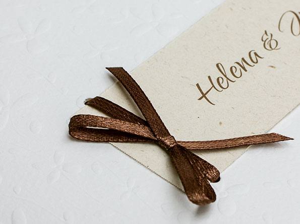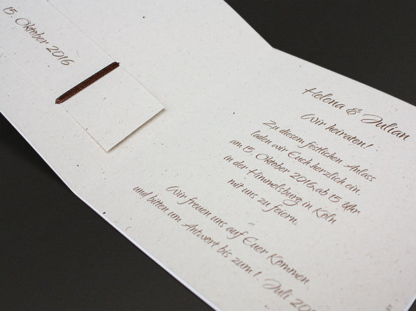 Ein besonderes Highlight ist die braune Schleife, an der ein Anhänger befestigt wird, der sich auf der Innenseite fortsetzt. Eure Einladungstexte werden auf einen hochwertigen Einleger gedruckt, der – genau wie der Anhänger – aus speziellem Karton mit natürlichen Stroheinschlüssen gefertigt ist.