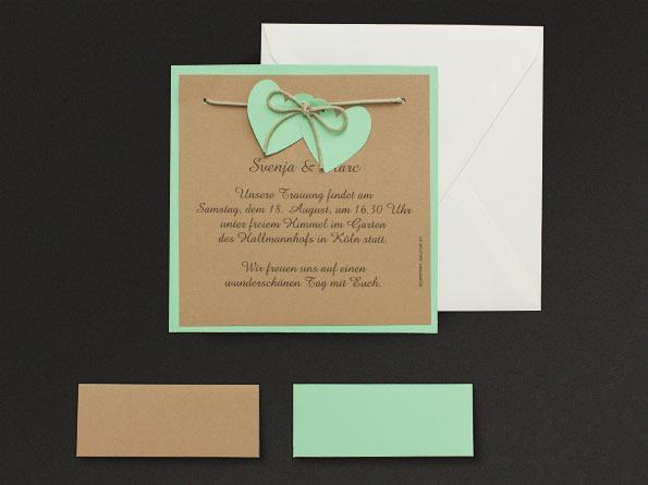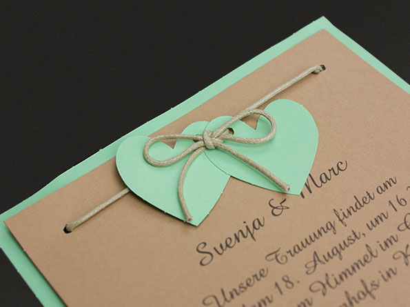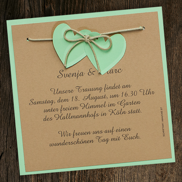 Hochzeitseinladungen Country-Style mit grünen Herzen