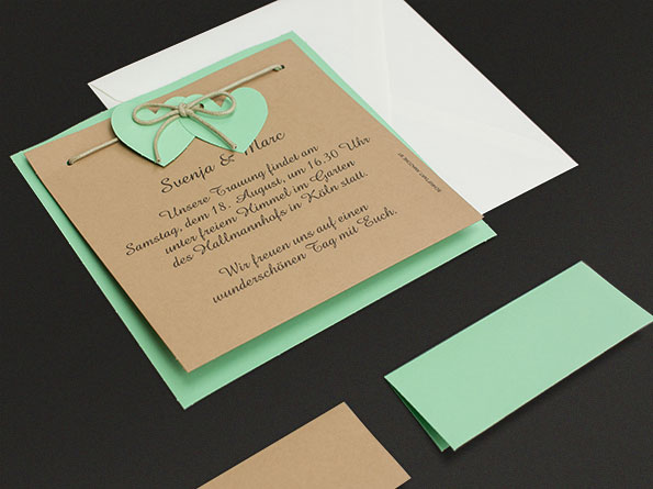 Einladungskarten zur Hochzeit im beliebten Country-Style. Als Materialien kommen hier hellbraunes Kraftpapier und grüner Naturkarton zur Verwendung.