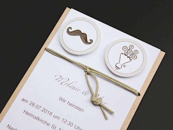 Große Hochzeitseinladung mit zwei aufgeklebten Buttons und angknüpfter Kordel, sowie eine kleinere Zusatzkarte. Beide im Vintage-Style gestaltet.