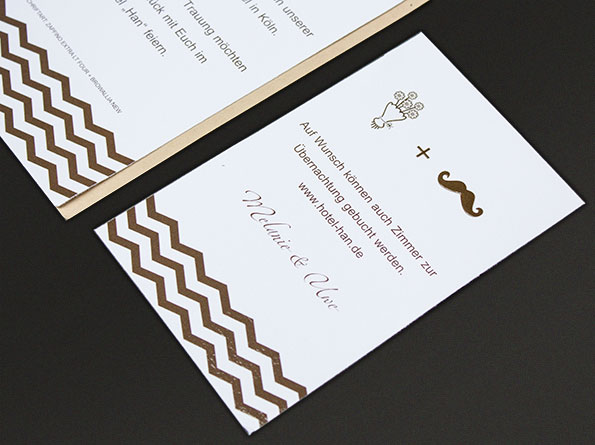 Die Hochzeitseinladungen werden mit passenden Kuverts und einer kleineren Zusatz-Karte geliefert, die mit weiteren Infos bedruckt werden kann.