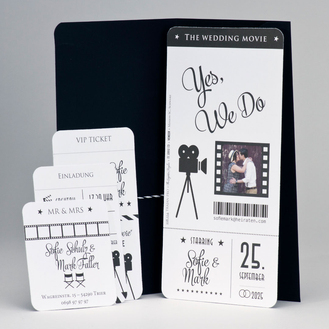 Originelle Einladungskarten zur Hochzeit, gearbeitet als Pocketkarte. Eine große Karte, sowie drei kleinere Zusatzkärtchen bieten viel Platz für Informationen. Alles in ausgefallenem Design gestaltet. Viele kleine Symbole lassen Filmset-Atmosphäre entstehen. Ein Highlight ist Euer persönliches, in die Karte gedruckte Foto. Natürlich kann das auch wegbleiben, wenn Ihr das Wünscht. Hergestellt sind diese Hochzeitseinladungen aus mattem schwarzen Karton, auf welchem eine seidig-glänzende Filmkamera aufgedruckt ist. Noch zu erwähnen bleibt eine Kordel, an die ein kleiner Anhänger geknüpft werden kann. Die Karten werden nach links aufgeklappt.