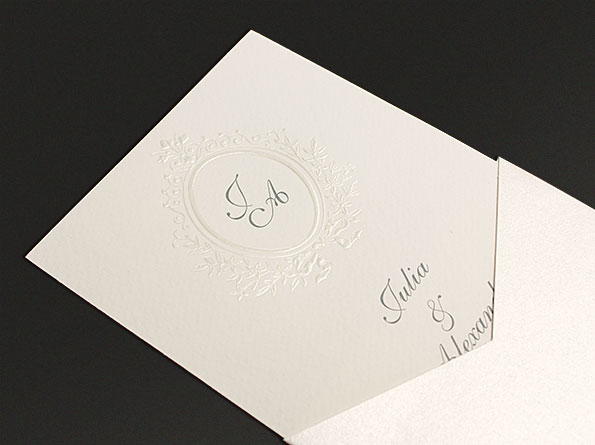 Cremefarbige Hochzeitskarten aus strukturiertem Naturkarton, die in eine ebanfalls cremefarbige, aber perlmuttartig, irisierende Hülle eingesteckt wird. Keine Klappkarte. Die Einladungen sind mit einer verspielten und seidenmatt lackierten Prägung dekoriert. Abgerundet werden diese schicken Hochzeitskarten von einer weißen, um die Hülle gebundenen Schleife.