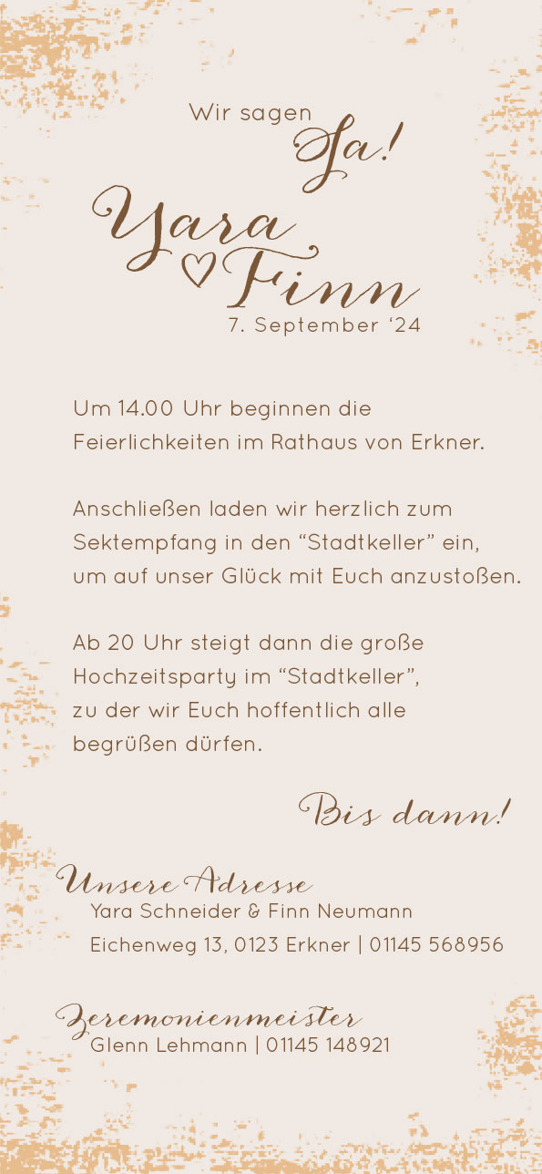 Die Texte werden von unseren Profis passend zur Karte in Form gebracht. In Kürze erhaltet Ihr noch vor Druckbeginn per E-Mail eine PDF-Datei zur Ansicht. Hier ist die Karte zu sehen, wie sie bedruckt aussehen wird. Natürlich könnt Ihr dann an Euren Texten noch Änderungen vornehmen lassen – ohne Aufpreis.