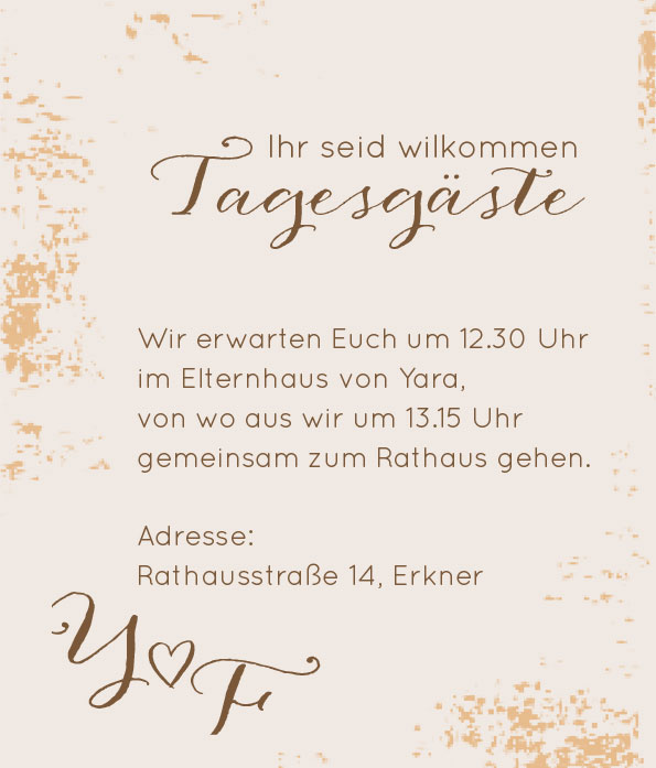 Übrigens: Die Abbildungen unten dienen als Ansicht oder Inspiration für Euch. Wir werden Eure persönlichen Texte in diesem Style gestalten. Es sei denn, Ihr äußert andere Wünsche.