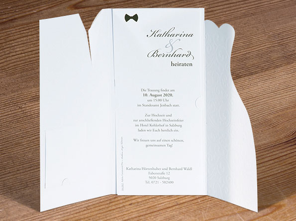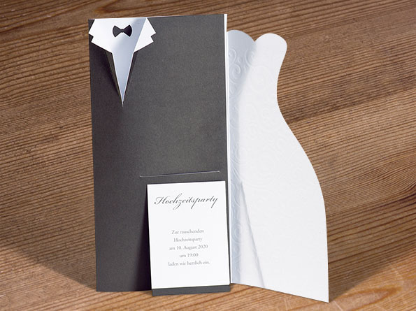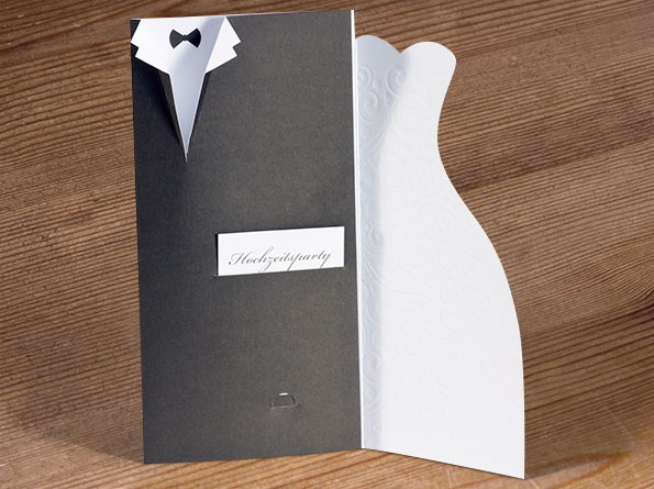 Hochzeitseinladungen als Brautkleid und Hochzeitsanzug gestaltet.