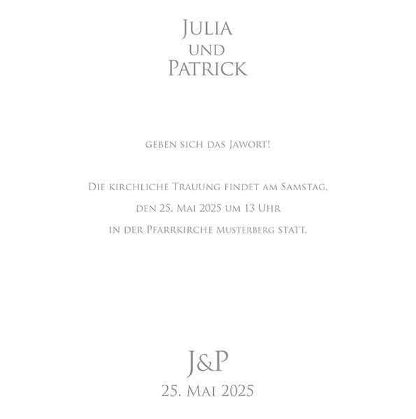 Die Texte werden von unseren Profis passend zur Karte in Form gebracht. In Kürze erhaltet Ihr noch vor Druckbeginn per E-Mail eine PDF-Datei zur Ansicht. Hier ist die Karte zu sehen, wie sie bedruckt aussehen wird. Natürlich könnt Ihr dann an Euren Texten noch Änderungen vornehmen lassen – ohne Aufpreis.