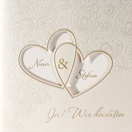Schillernde Hochzeitseinladungen mit zwei goldenen Herzen