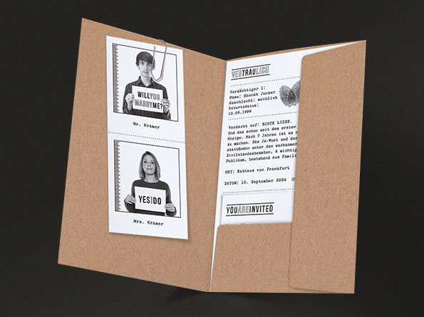 Trendige, als Mappe gestaltete Hochzeitseinladungen, mit welchen Ihr auf besonders originelle Art zu Eurem Hochzeitsfest einladen könnt.