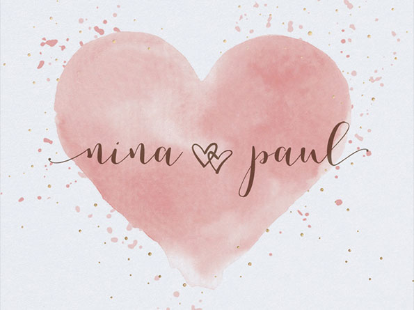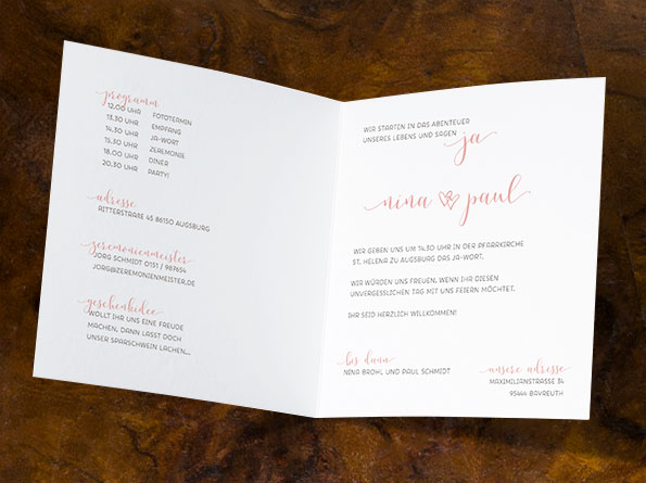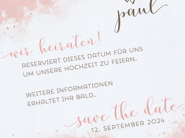 … ziert diese rosa gehaltenen Hochzeitseinladungen. Schillernder Karton und goldener Foliendruck kommen bei der Fertigung dieser Hochzeits-Serie zur Verwendung. Zusammen mit der Hochzeits-Papeterie aus dem Set wird Euer schönster Tag perfekt werden!