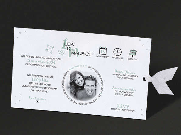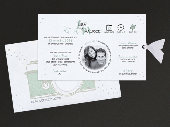 Ladet doch einfach mit Eurem persönlichen Foto zur Hochzeit ein. Diese fröhlich gestalteten Hochzeitseinladungen bieten sich dafür an. Gefertigt als Umschlag, in den ein Texteinleger gesteckt wird. Die Konturen der gezeichneten Kamarea sind als silberner Foliendruck ausgeführt. Durch eine Stanzung im „Objektiv” der Kamera ist Euer Bild auf der Aussenseite prominent sichtbar. Das Materiel dieser Hochzeitseinladungen ist schillernder Perlmuttkarton. Die Einladungstexte und die Abbildung drucken wir auf den Einleger.