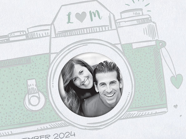 Fotokarte mit im Comicstil gezeichneter Kamera. Im Objektiv ist eine Abbildung des Brautpaares abgedruckt.