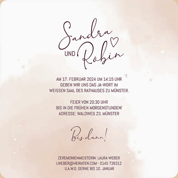 Die Texte werden von unseren Profis passend zur Karte in Form gebracht. In Kürze erhaltet Ihr noch vor Druckbeginn per E-Mail eine PDF-Datei zur Ansicht. Hier ist die Karte zu sehen, wie sie bedruckt aussehen wird. Natürlich könnt Ihr dann an Euren Texten noch Änderungen vornehmen lassen – ohne Aufpreis.