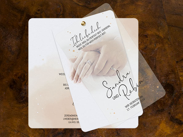 Die Karten bestehen aus drei Teilen, die elegant mit einer edlen Messingklammer zusammengehalten werden. Der Mix aus perlmuttartig schillerndem Metallic-Karton und einem transparenten Deckblatt verleiht der Einladung eine exklusive Note. Ergänzt wird das Design durch ein zartes Aquarell in Apricot-Tönen und zahlreiche goldene Herzen als edle Veredelung.