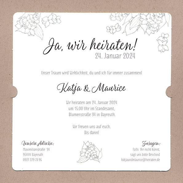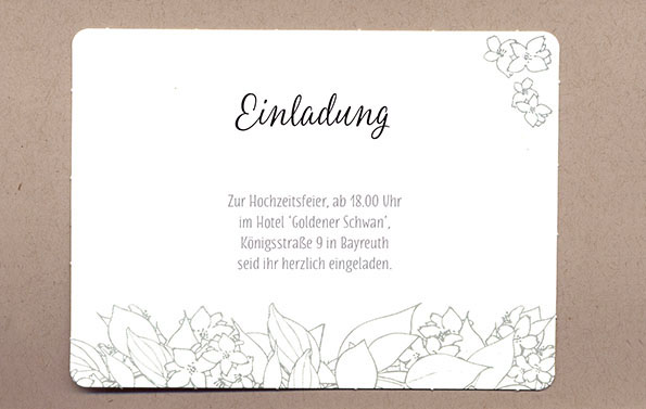 Die Texte werden von unseren Profis passend zur Karte in Form gebracht. In Kürze erhaltet Ihr noch vor Druckbeginn per E-Mail eine PDF-Datei zur Ansicht. Hier ist die Karte zu sehen, wie sie bedruckt aussehen wird. Natürlich könnt Ihr dann an Euren Texten noch Änderungen vornehmen lassen – ohne Aufpreis.