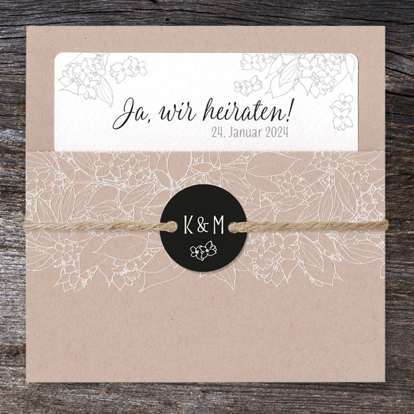 Die Karte klappt nach unten auf und gibt den Blick auf den cremefarbenen, fein strukturierten Naturkarton frei, der für Eure Einladungstexte und ein Zusatzkärtchen genutzt wird. Ein besonderes Highlight ist die Natur-Kordel, die die Karte verschließt und an der ein kleiner, runder Anhänger befestigt wird. Ihr könnt diesen Anhänger mit Euren Initialen, dem Hochzeitsdatum oder einem anderen liebevollen Detail personalisieren.