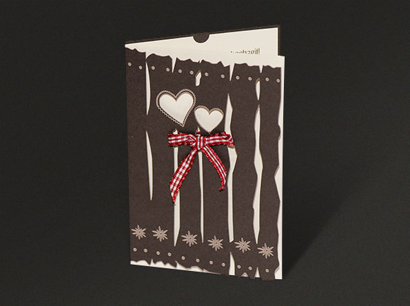 Ihr denkt über eine Scheunenhochzeit oder Trachtenhochzeit nach? Dann könnten diese Einladungskarten mit rustikalem Zaun durchaus passen. Gefertigt aus cremefarbenem Designkarton (Einleger) und dunkelbraunem Karton (Umschlag). In den Einleger der Hochzeitseinladungen drucken wir Eure Texte – wenn gewünscht. Der Zaun und die zwei Herzen sind per Laserstrahl aus dem dunklen Karton „ausgeschnitten“. Dies sorgt für ein tolles, dreidimensionales Erscheinungsbild, welches von der angeknüpften Schleife im Trachten-Style noch verstärkt wird. Die Einladungskarten werden nach links aufgeklappt.