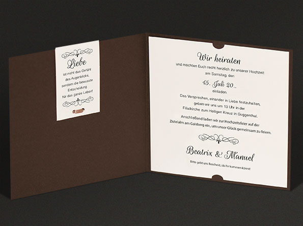 Sehr elegante Einladungskarten zur Hochzeit. In den braunen Umschlag wird rechts innen ein weißer Texteinleger eingeklemmt. An die linke Seite wird mittels eines Satin-Bändchens ein Zusatzkärtchen angeknüpft welches mit den Namen des Brautpaares und anderen Infos bedruckt werden kann. Die Hochzeitseinladungen werden nach links aufgeklappt.